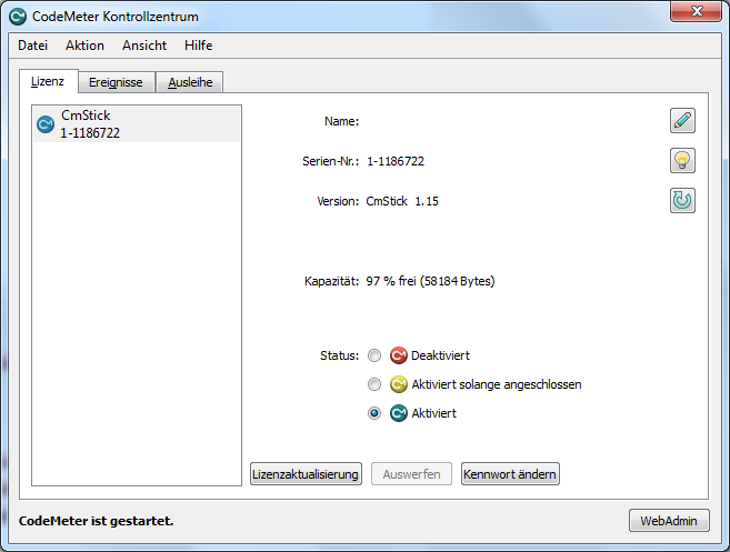 New licenses can be loaded to the CmStick without sending the key to WAVECOM. Just click License Update on the CodeMeter Control Center and follow the information provided by the assistant.